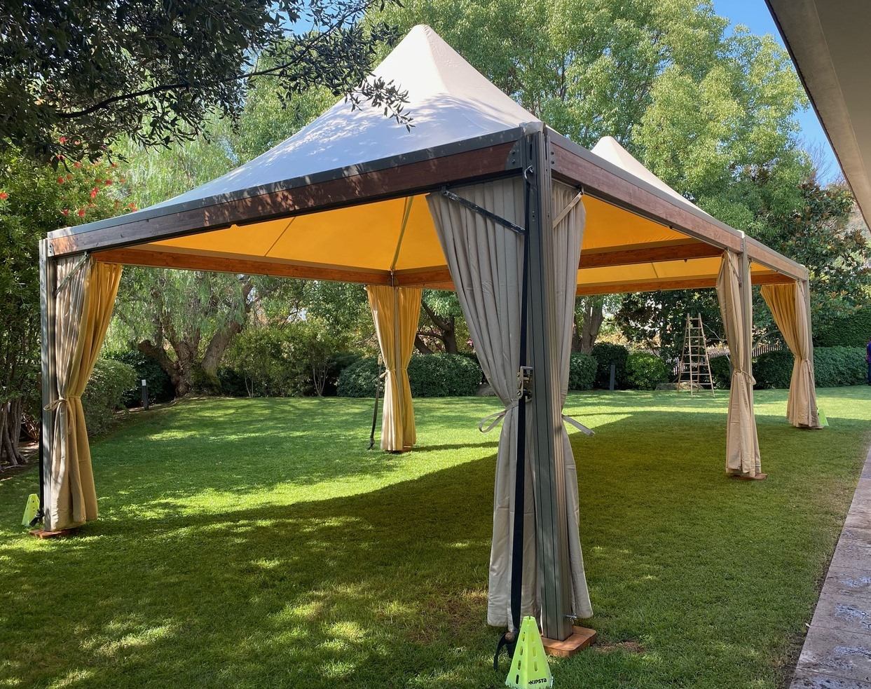 El montaje consta de la unión de dos carpas beige con cortinas de cerramiento. Este modelo de carpas de alquiler Barcelona, al estar unidas, comparten viga y patas. Las carpas modelo Eventop crean espacio elegantes y confortables y con sus vigas de madera se integran perfectamente en el paisaje.