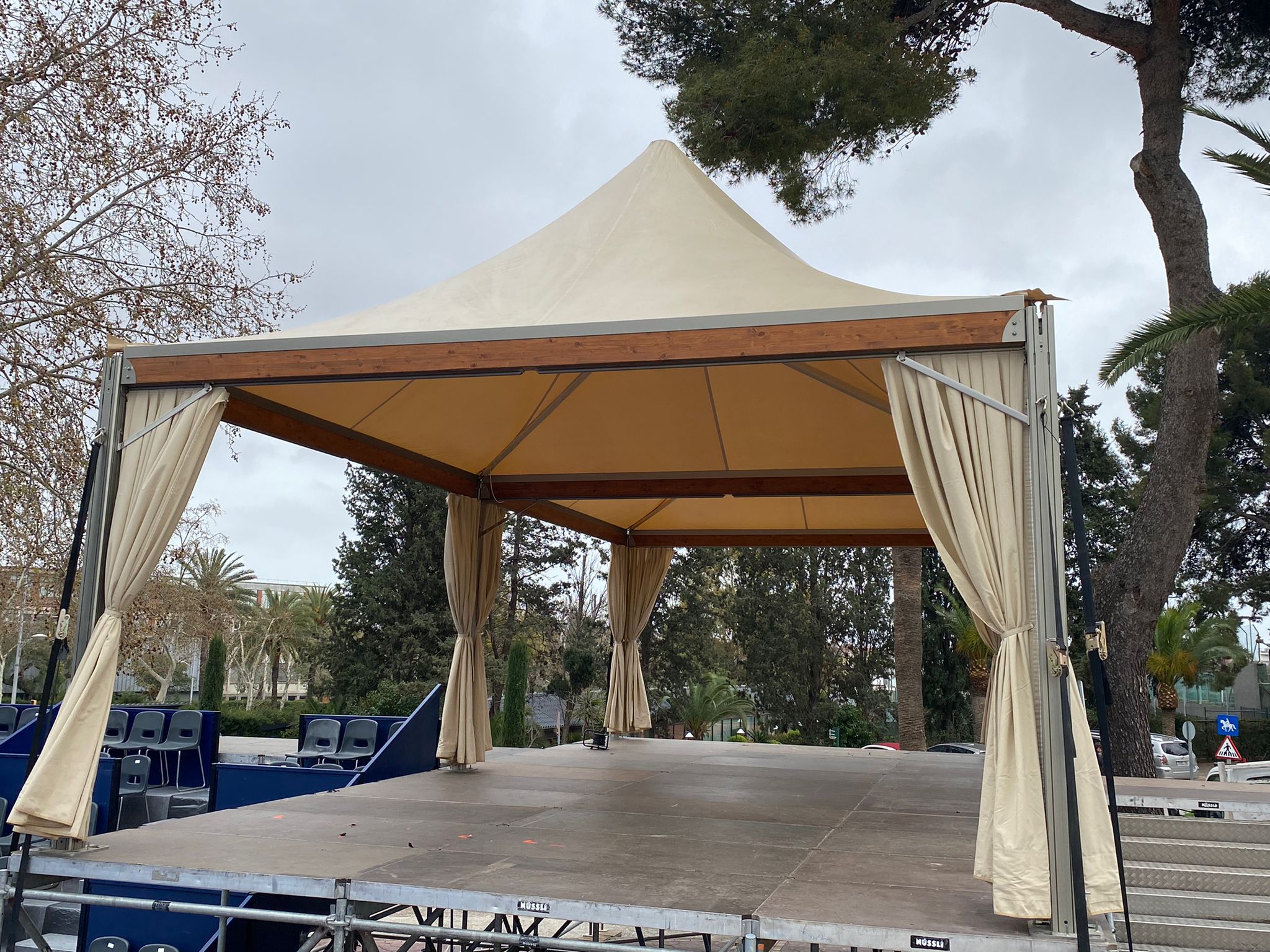 Creamos diferentes espacios cubiertos con carpas para eventos modules color beige, carpas de medidas 3x3m y 5x5m, e instalamos tarima de alquiler formando una estructura compacta e ideal como aislamiento térmico.