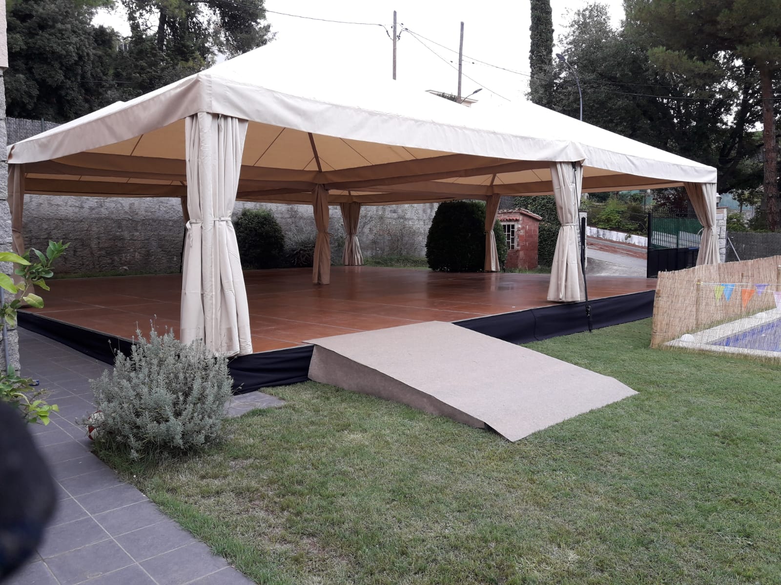 Carpas modulares color beige con cortinas de cerramiento del mismo color. Para facilitar a los asistentes el acceso a la carpa instalamos una rampa.