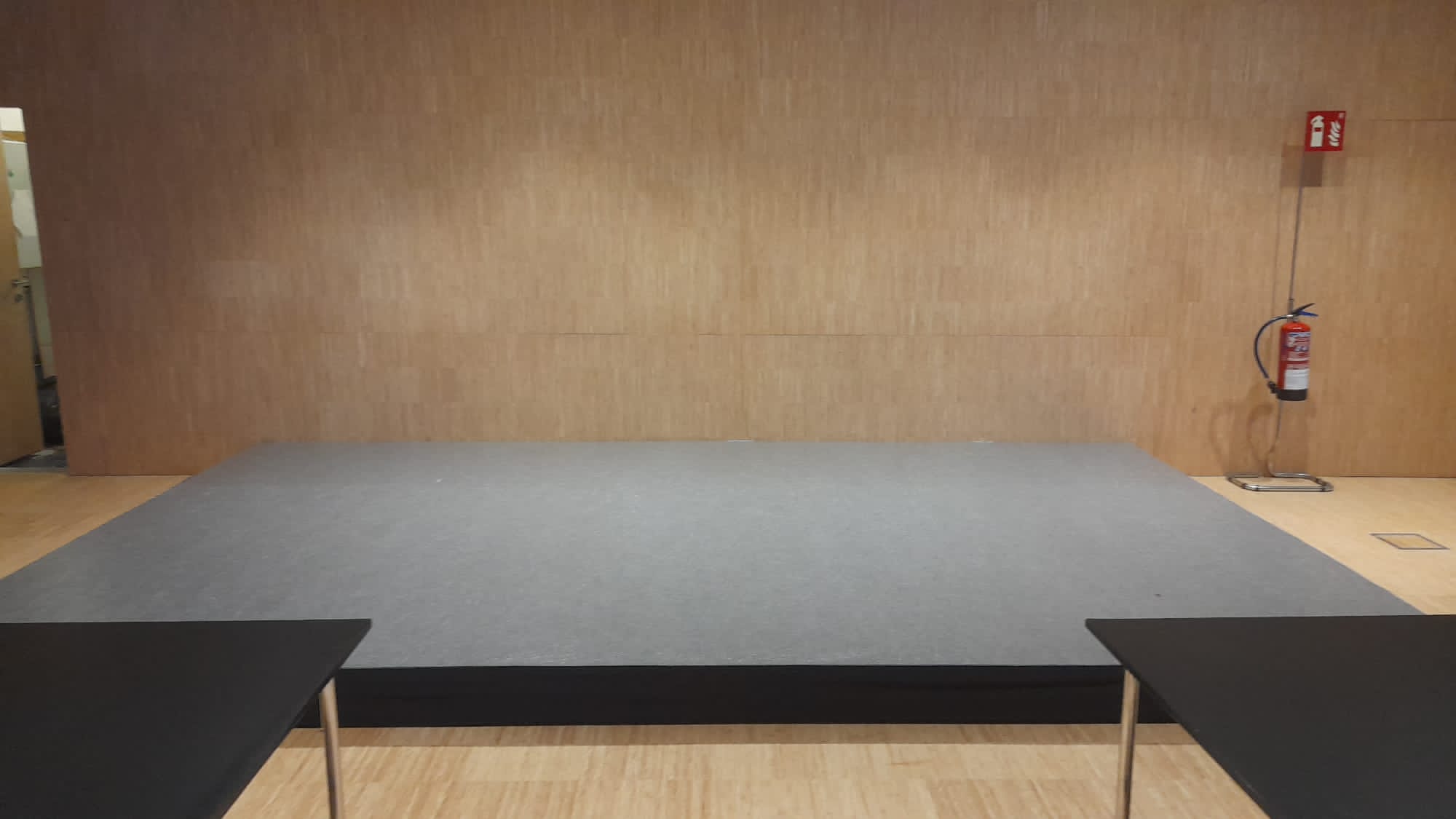 En esta ocasión instalamos un escenario de alquiler de medidas 5x3m con una altura de 0,20m para evento corporativo. El escenario lo cubrimos con moqueta y colocamos un faldón perimetral de color negro.